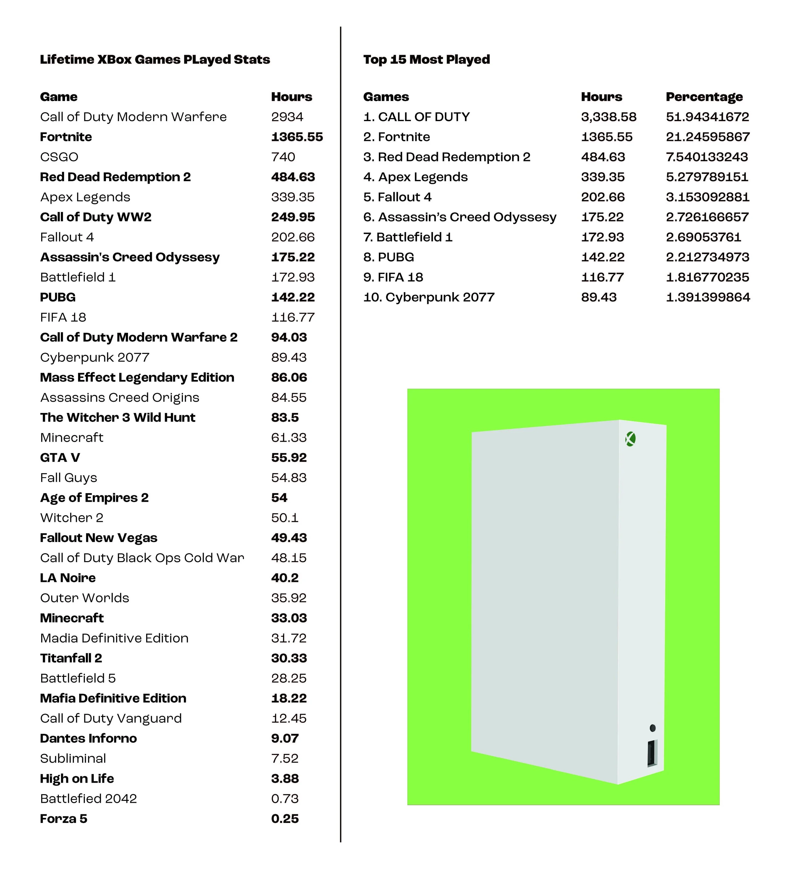 This particular infographic being based on the top ten xbox titles I have played throughout my lifetime, documented into sections of the Xbox console itself proportionate to the amount played.