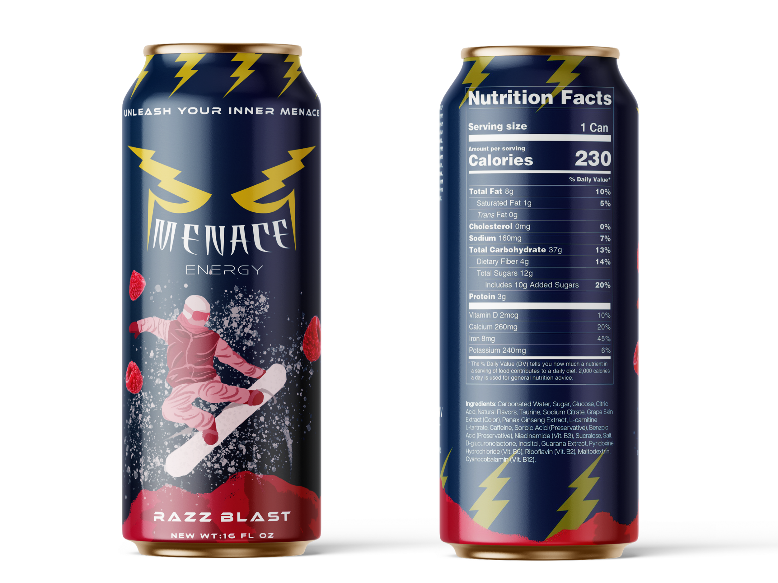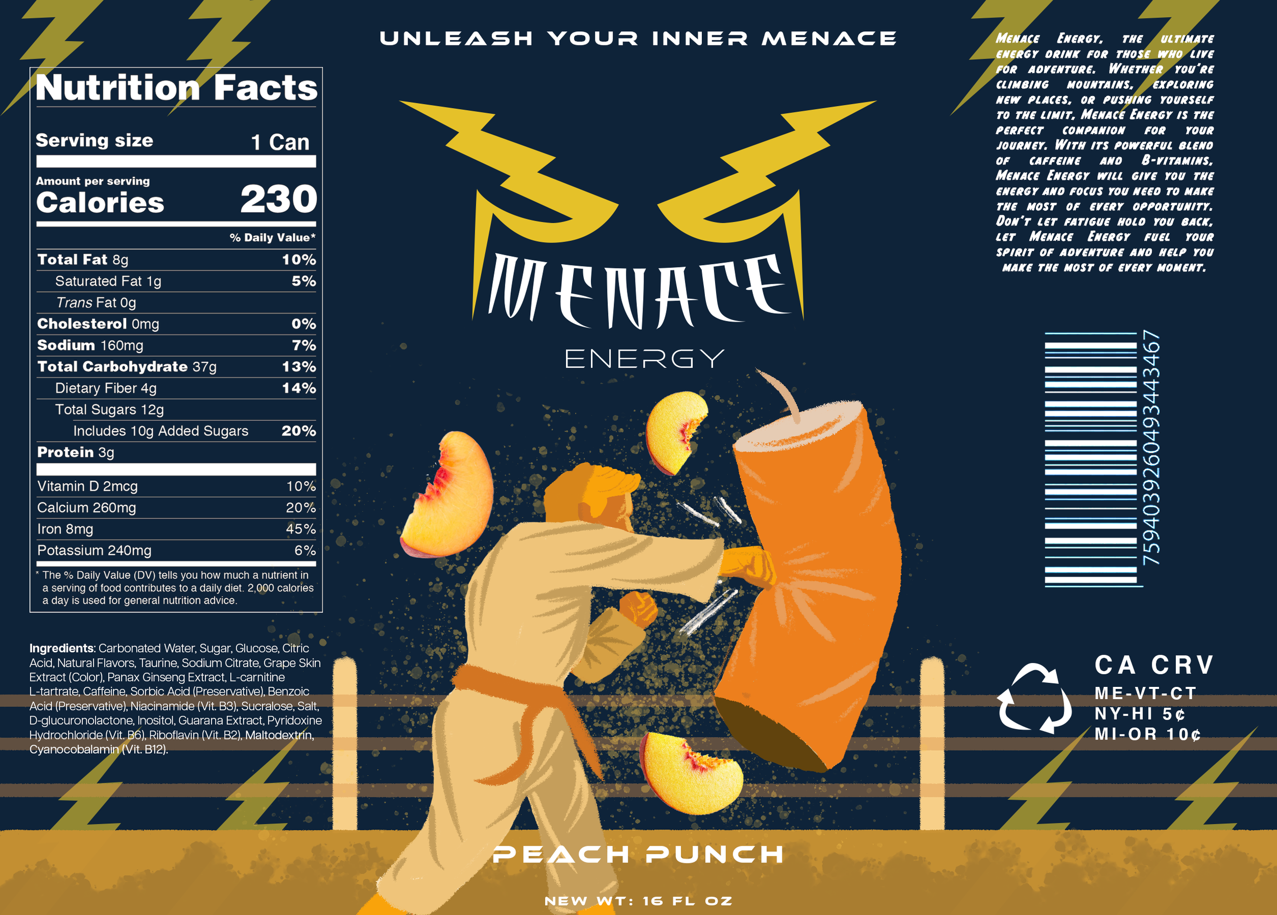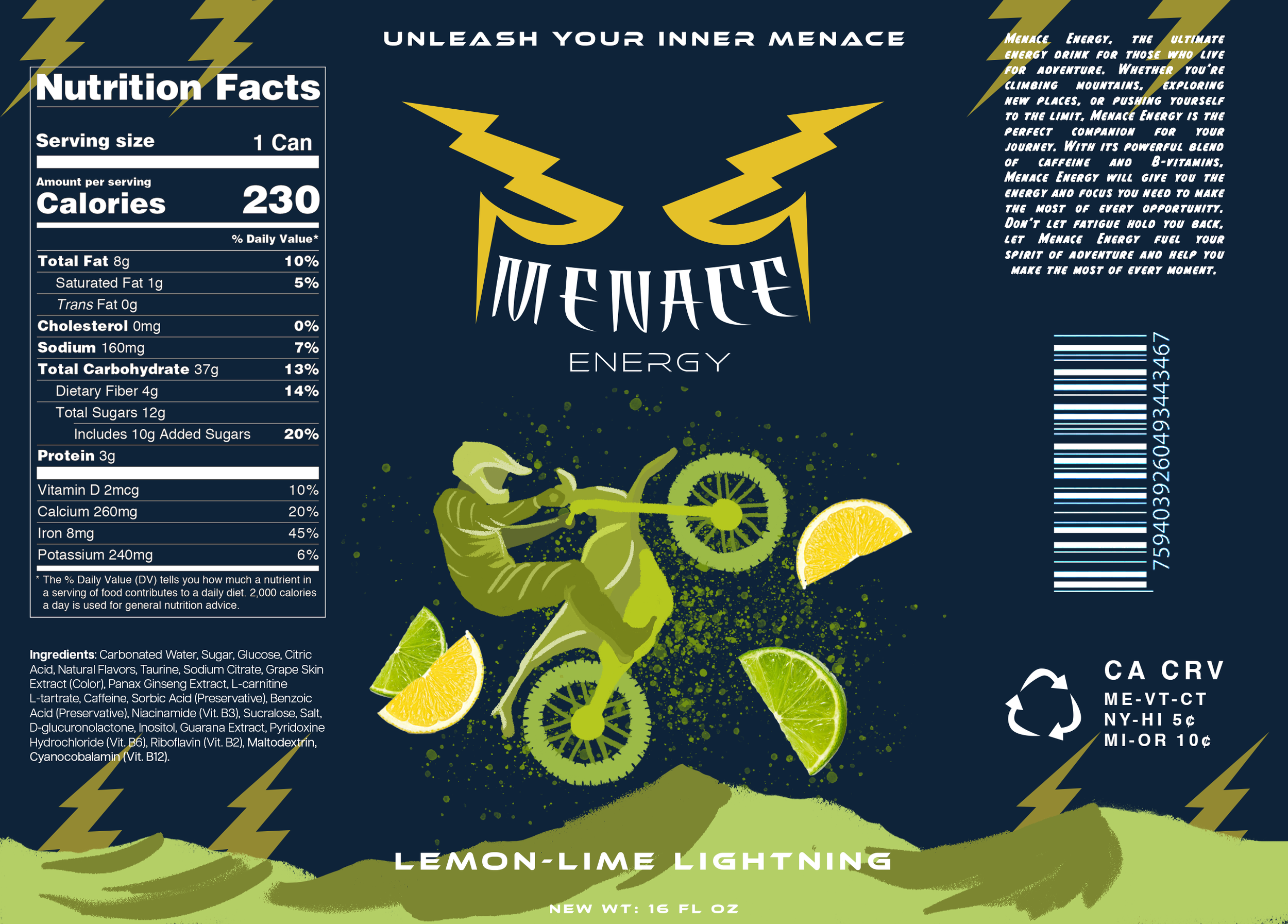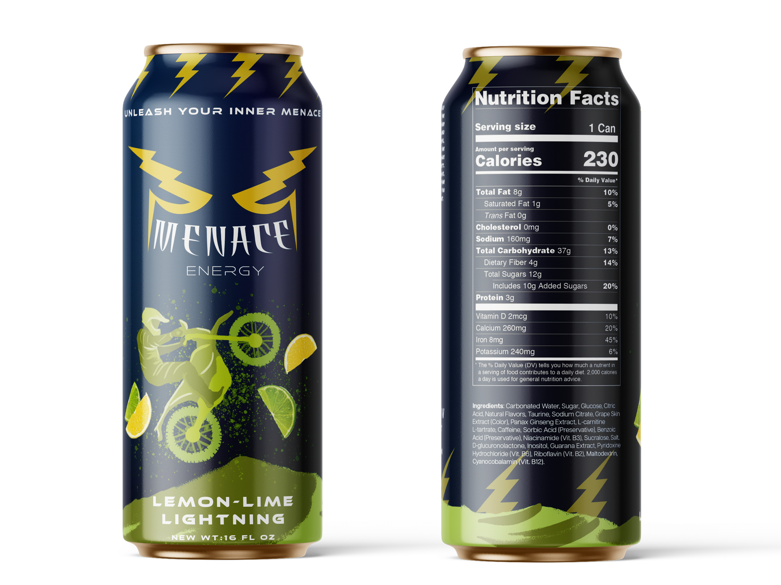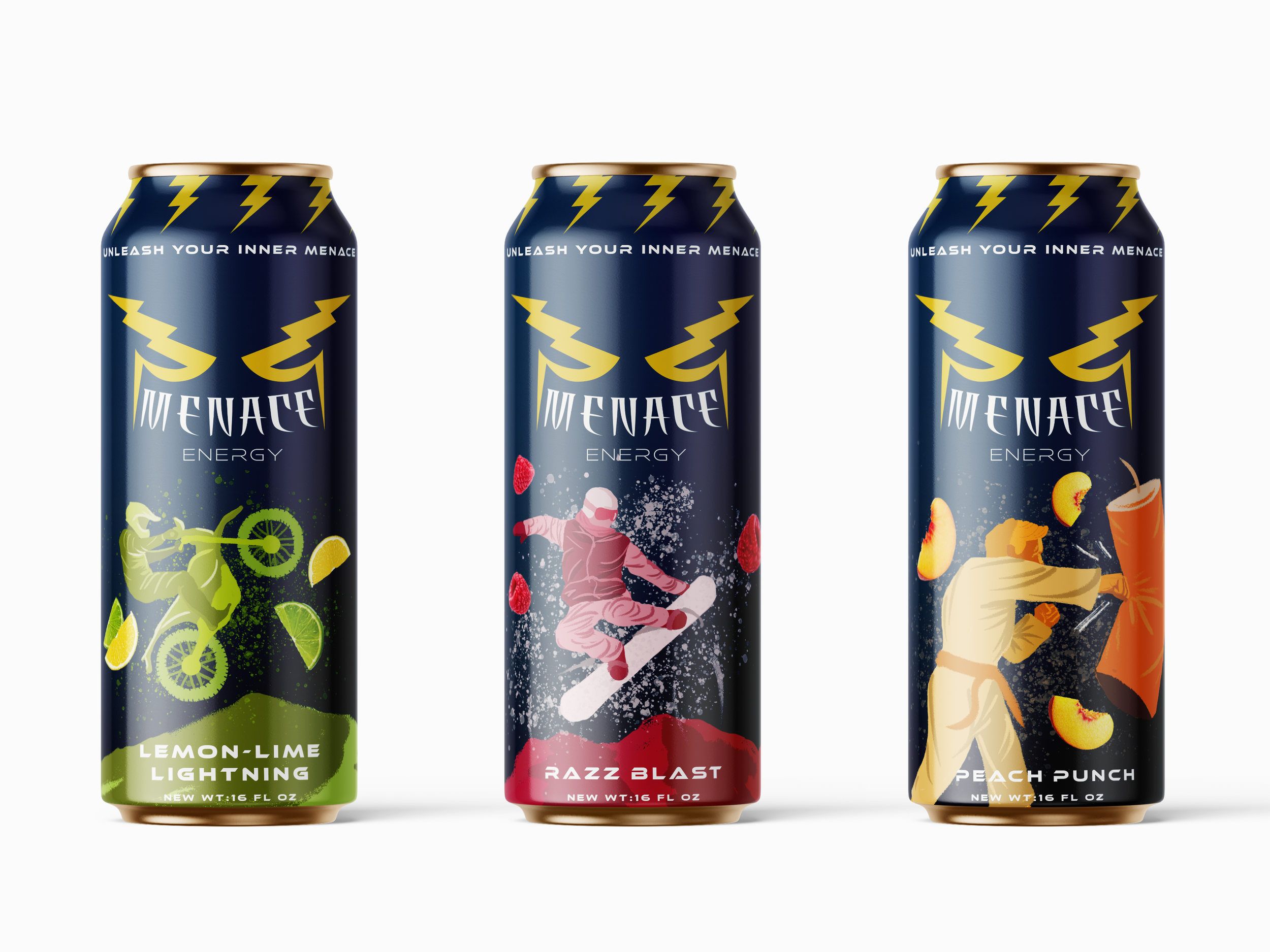 I crafted a compelling brand from my own sketches called Menace Energy, based on my own childhood nickname of “Enes the Menace”, to represent a new energy drink including a captivating logo and pleasing visuals ensuring a seamless blend of brand messaging and aesthetic appeal.